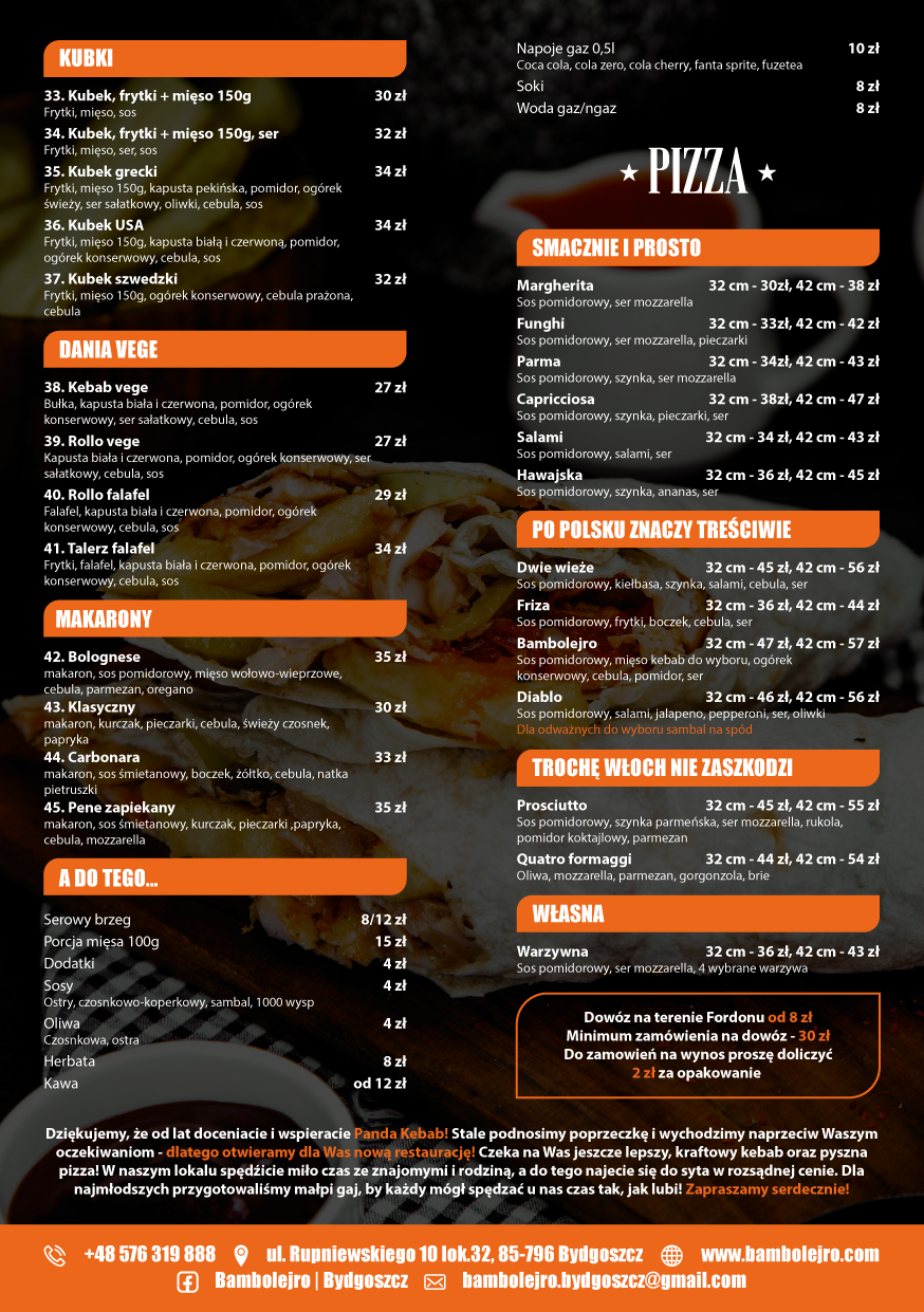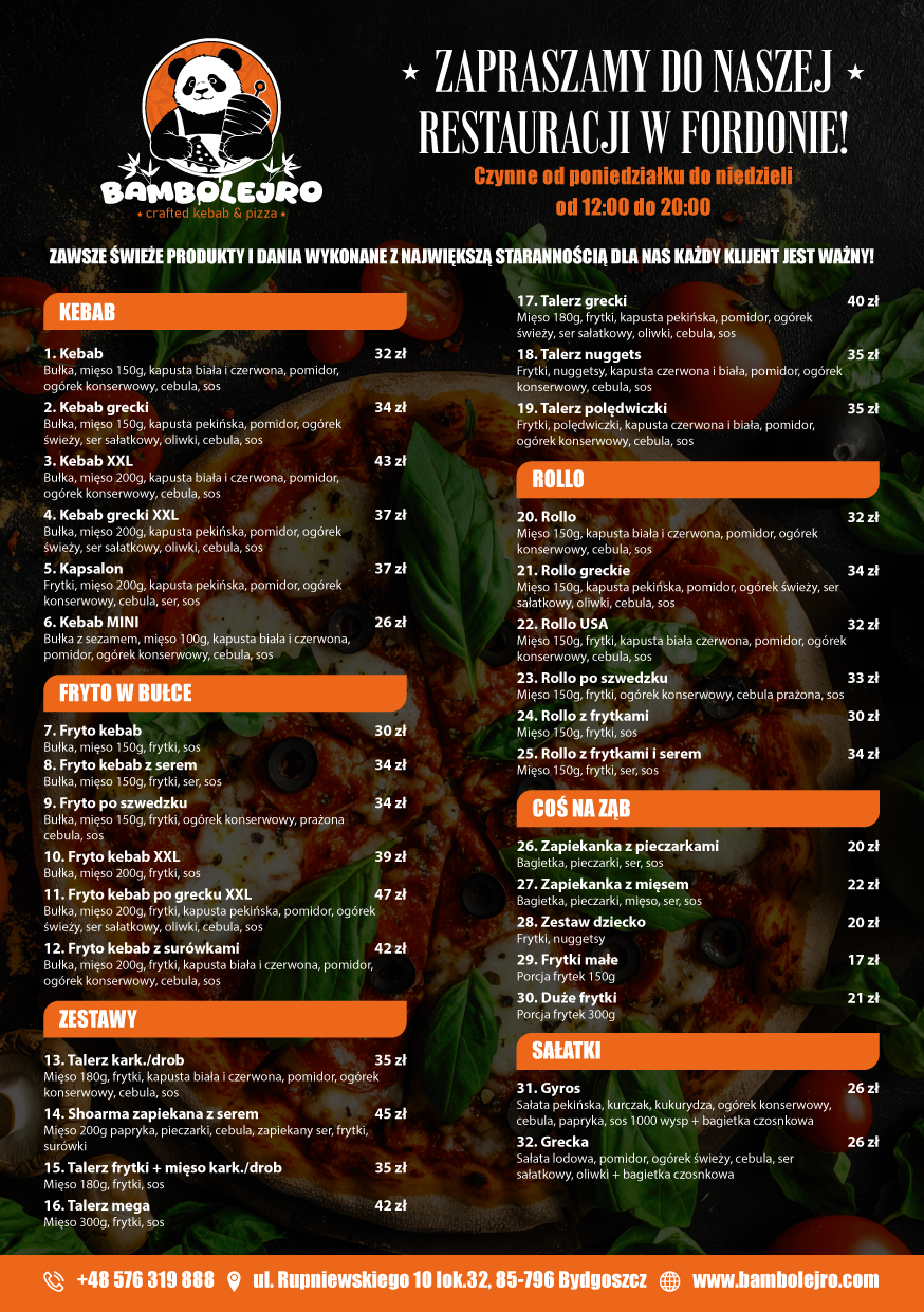 Nie kombinujemy – robimy to, co kochamy, i robimy to dobrze. Każdego dnia dokładamy wszelkich starań, żebyś wychodził od nas najedzony, zadowolony i z uśmiechem na twarzy. Uwielbiamy, gdy wracacie – to dla nas największa nagroda i dowód na to, że robimy to dobrze. W Bambolejro każdy znajdzie coś dla siebie – od klasycznego kebaba w bułce, przez rollo, aż po nasze wyjątkowe wersje greckie i szwedzkie. Ponadto poszerzyliśmy ofertę o przepyszną pizzę! Możesz liczyć na szybką obsługę, miłą atmosferę i zawsze świeże produkty. Nasz zespół to ludzie z pasją – życzliwi, energiczni i zawsze gotowi, by doradzić albo po prostu zapytać, jak minął Ci dzień. Znajdziesz nas w Bydgoszczy, przy ul. Jerzego Rupniewskiego 10 / lokal 32 – łatwo nas znaleźć, jeszcze łatwiej pokochać!